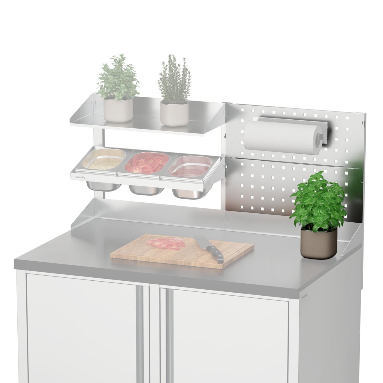 Das quub Rückwandsystem ist eine intelligente Erweiterung Ihrer Outdoorküche, mit der Sie Ihre Arbeitsfläche noch praktischer gestalten können. Der Basisanbau besteht aus drei Trägern und kann in zwei Höhen montiert werden – wahlweise als zweistöckige Rückwand oder als Umrandung der Arbeitsplatte. Während beim Einzelmodul nur zwei Träger benötigt werden, nutzt das Doppelmodul alle drei Träger für eine größere Arbeitsfläche. Dank verschiedener Einsätze können Sie das Rückwandsystem individuell anpassen. Der Regaleinsatz schafft zusätzlichen Stauraum, während der Gastronorm-Einsatz perfekt für standardisierte Behälter geeignet ist (wahlweise für 3x 1/6GN oder 1x 1/6GN + 3x 1/9GN). Die Lochblechhalterung ermöglicht eine flexible Nutzung mit Haken- oder Magnethaltersystemen, sodass Sie Ihre Küchenutensilien stets griffbereit haben. Ein Küchenrollenhalter, der sich in das Lochblechmuster der Rückwand einfügt, sorgt für zusätzlichen Komfort, während der Spritzschutz Ihre Arbeitsfläche sauber hält – ideal für die Zubereitung von Pizzateig. Gefertigt aus hochwertigem, gebürstetem Edelstahl, ist das Rückwandsystem besonders robust, langlebig und wetterbeständig, sodass es optimal für den Einsatz im Freien geeignet ist.
