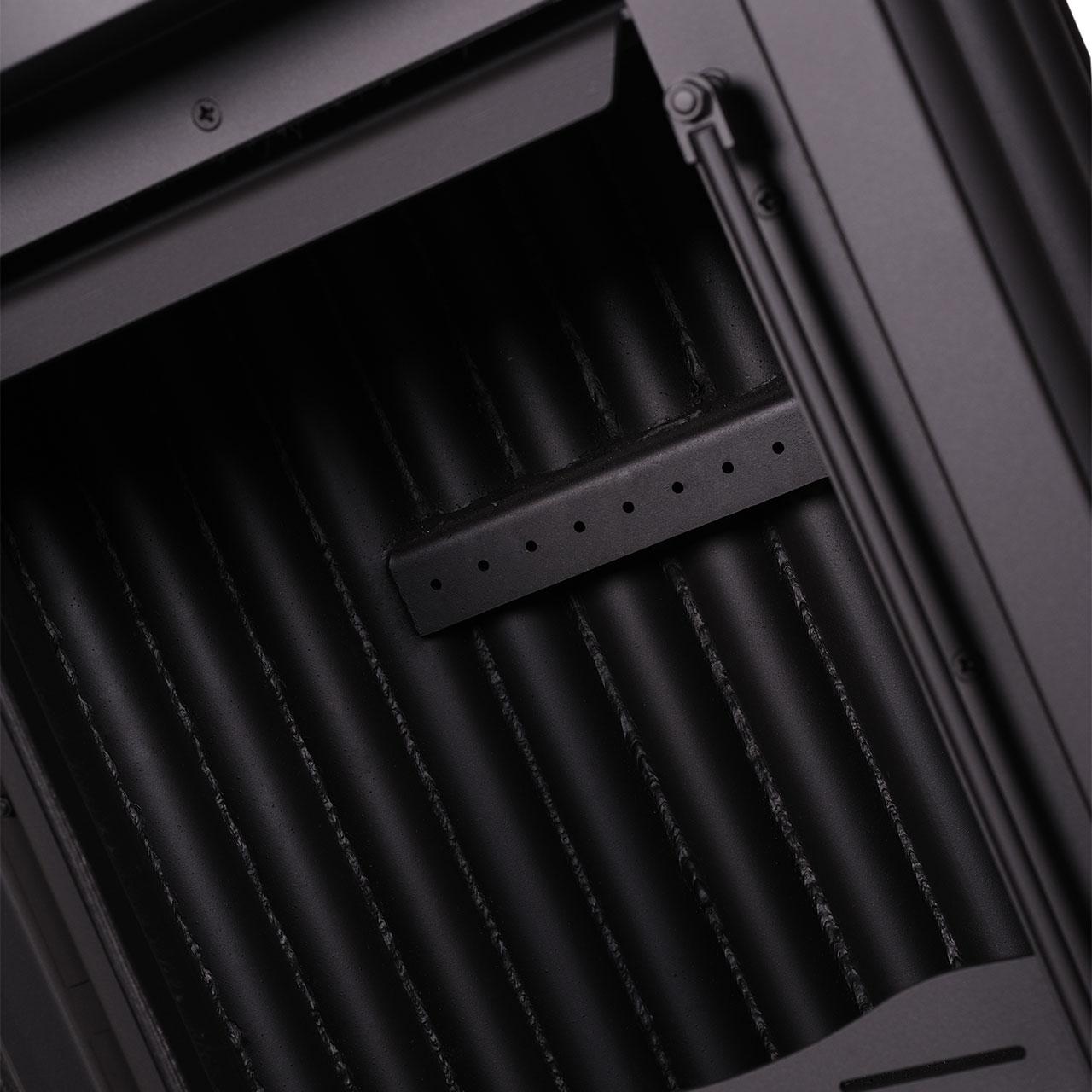 Eine Besonderheit des Warmluftofen Masterflamme Medie 2 ist seine große Brennkammer. Der Feuerraum wurde massiv konstruiert und an besonders beanspruchten Stellen erweitert. Der Warmluftofen wurde so gebaut, dass Sie bis zu acht Stunden heizen können, ohne Holz nachzulegen. Die Verbrennung bei diesem Werkstattofen ist also auf Brennstoffseinsparung ausgelegt. Das wird erreicht, in dem der Werkstattofen zwischen drei Verbrennungsstufen unterscheidet und so nahezu alle Bestandteile des Holzes nutzt. Bei der Nachverbrennung des Scheitholzes werden auch viele Schadstoffe direkt wieder zersetzt. Auf diese Weise wird auch die Emissionsdichte reduziert.